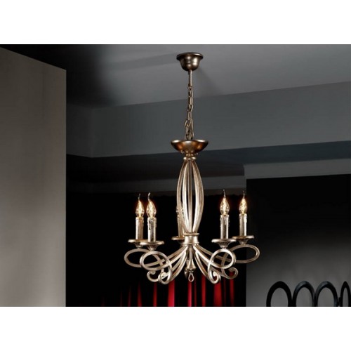 Люстра из металла с 5 лампами, покрытие из серебряной фольги с патиной под старину, поставляется в комплекте с деталью для подвешивания люстры без цепи непосредственно к потолку. 5 E14..