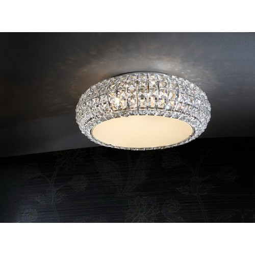 Потолочный светильник маленький из металла с покрытием ''хром'', плафон из квадратных кристаллов из прозрачного стекла, нижний рассеиватель из стекла опалового цвета, 6 G9 40W..