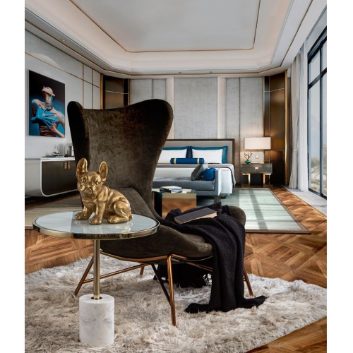 Фигура маленького размера, собака породы французский бульдог, из полистоуна с покрытием из золотой фольги.