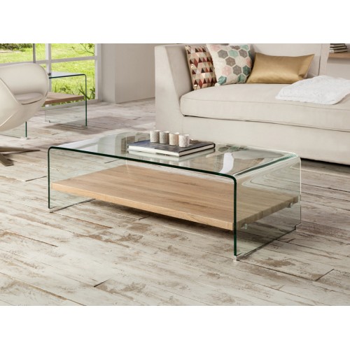 Стол журнальный из прозрачного изогнутого закалёного стекла толщиной 10 мм. Полка из MDF с меламиновым покрытием с отделкой "дуб сонама".